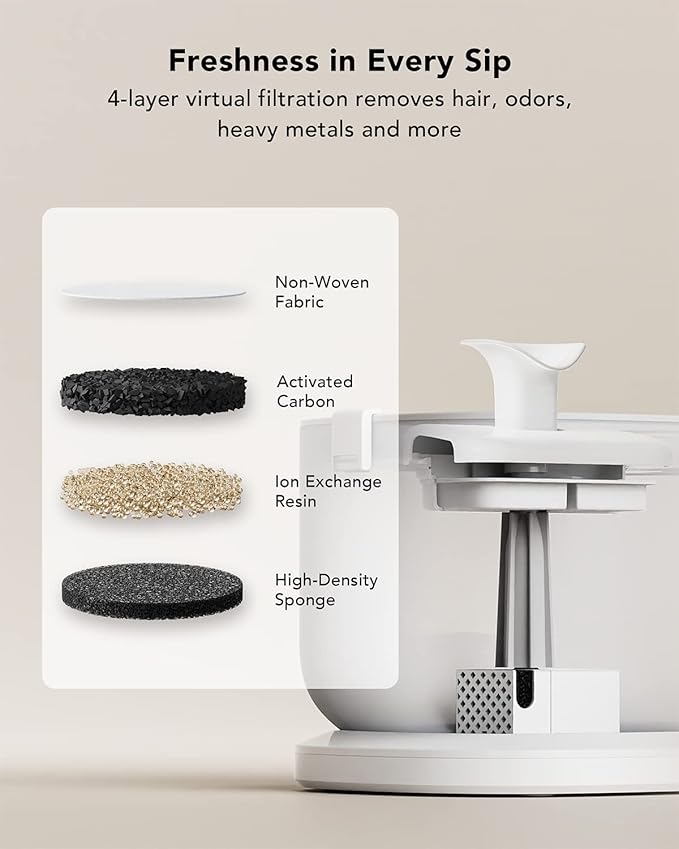 - Vertical Filtration System – Every drop of water is filtered through multi-layer filtration to remove all impurities and provide oxygen-enriched and better-tasting water. 1. Activated carbon eliminates foul odors 2. Ion exchange resin removes heavy metal ions and softens water quality 3. The non-woven fabric captures cats’ hair and impurities 4. The built-in pump sponge further filters debris to prevent blockages and damage.